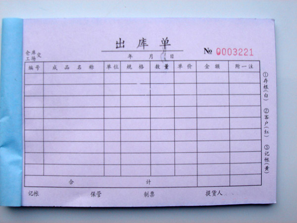 二、票據聯單印刷用的什么紙? 票據聯單印刷表面用紙是牛皮紙、內頁用紙是無碳原漿復寫紙,無碳復寫紙是一種隱色復寫紙,能夠直接復寫,它主要是在外力作用下,使微膠囊中的力敏色素和油溶液溢出與顯色劑接觸后發生染色反應,從而起到復寫的作用。無碳復寫紙可分為他顯色和自顯色兩種,按紙的顏色分有紅、黃、綠、藍、白五種;按顯現的色跡分有藍、黃、橙、黑、紅等顏色,票據聯單分為手寫聯單和機打聯單,手寫聯單通常用55g的無碳復寫紙,機打的以三聯票為例:一層用48g、第二層用50g、第三層用48g的無碳復寫紙。 |